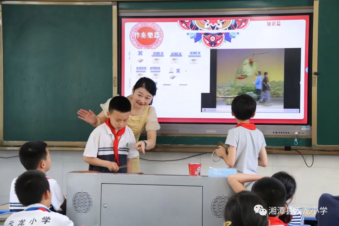 在学习《打铜锣》相关戏曲知识的课上,刘田雨老师和孩子们一起,欣赏戏曲、分析花鼓戏表演特性、学习用传统乐器锣鼓演奏……,专业知识的系统学习,引导孩子们从更深层次理解花鼓戏的文化内涵。
