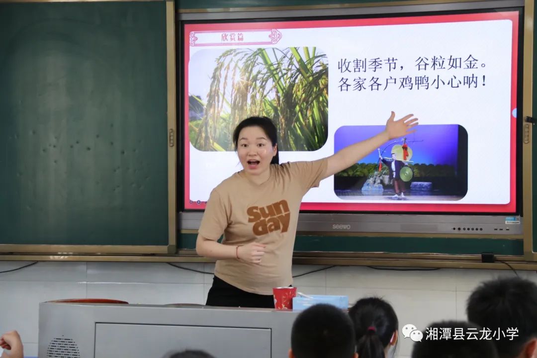 “收割季节,谷粒如金,各家各户,鸡鸭小心!”曾沛琪老师的铜锣呼唤,拉开了欣赏课的帷幕。曾老师巧妙设置的一个个问题,激发了孩子们欣赏的欲望,让他们在跌宕起伏的故事情节里,感受花鼓戏文化的魅力。